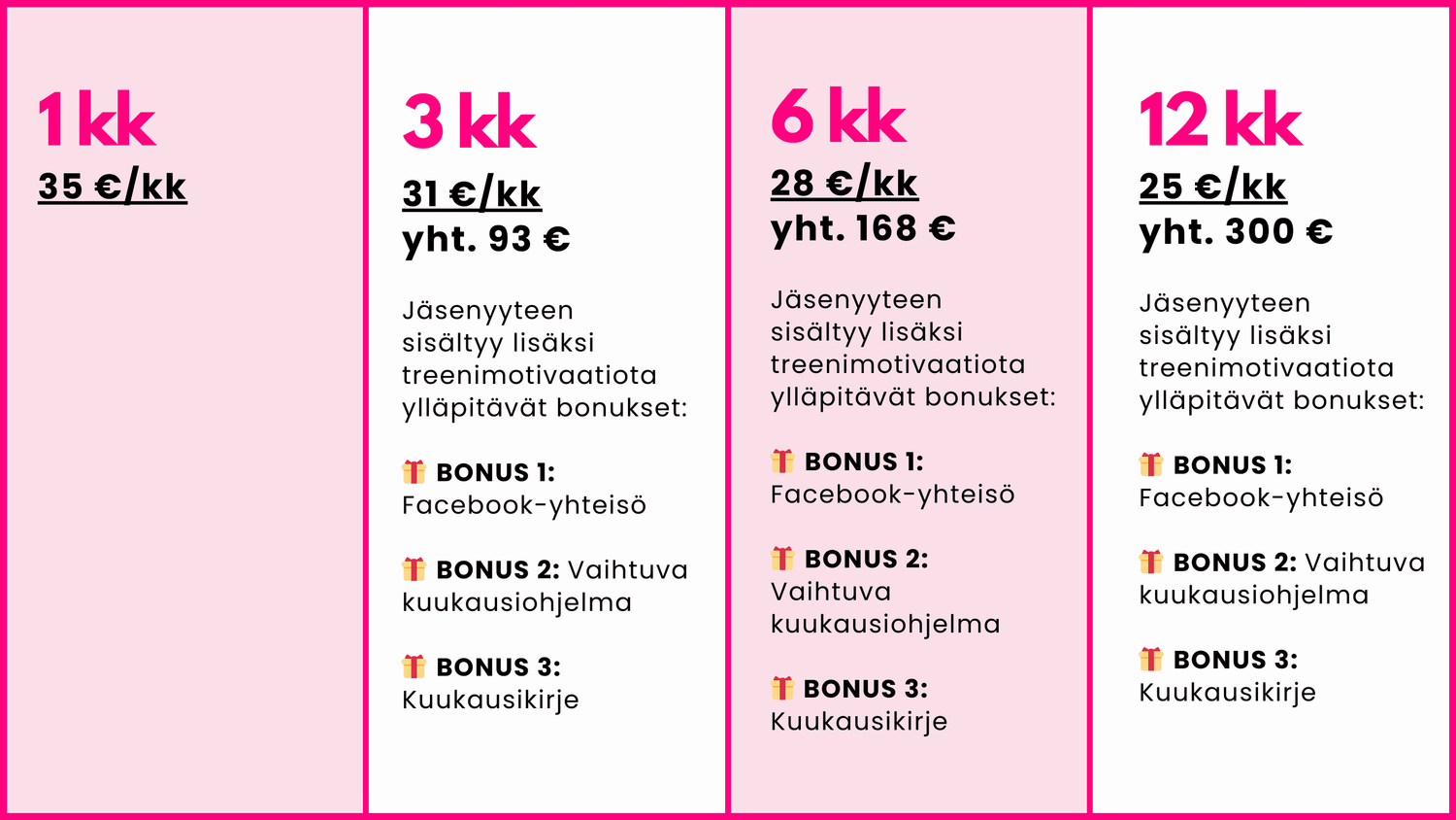 Useamman kuukauden jäsenyyksiin tarjoan lisäksi bonukset: