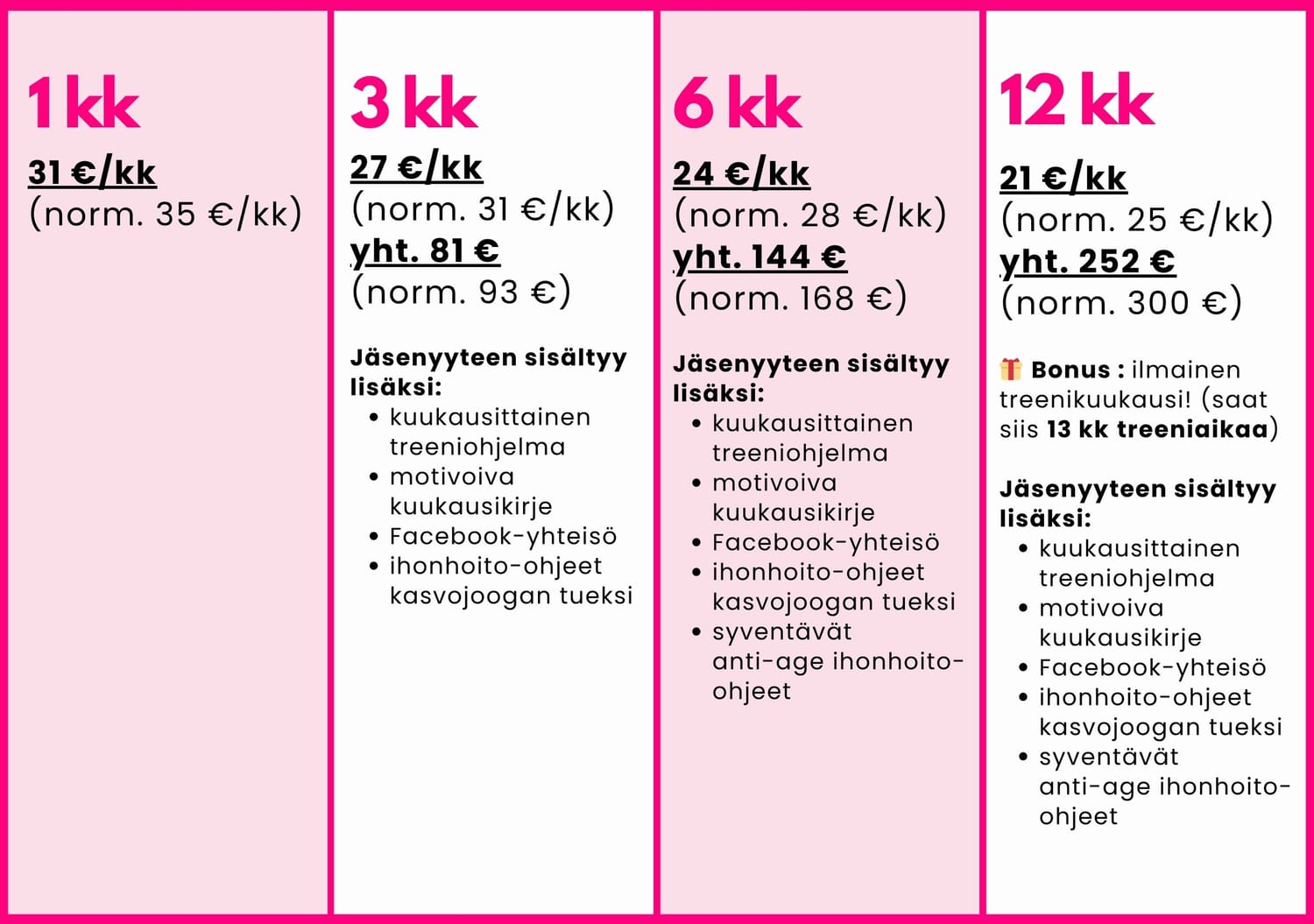 Valitsemasi jäsenyys maksetaan kerralla🩷 Mitä pidemmän jäsenyyden valitset, sen enemmän säästät! 12 kk jäsenyyteen saat nyt lanseerauskampanjan yhteydessä yhden kuukauden ilmaista treeniaikaa kaupan päälle🎁